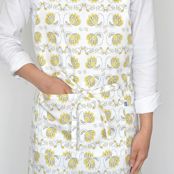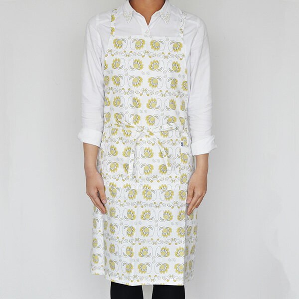 後ろでヒモをクロスさせ、フロント部分でリボンを結ぶエプロン。