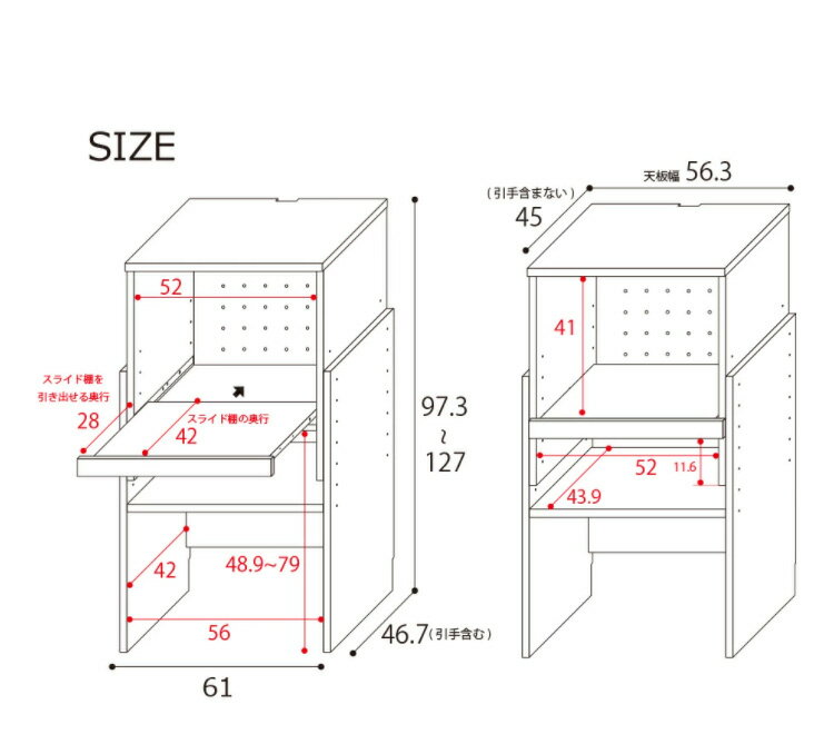 ■サイズ外寸:幅610×奥行き467×高さ973〜1270(mm)■耐荷重天板耐荷重:30kg棚板耐荷重:10kgスライド棚中央部耐荷重:10kg■材質プリント化粧繊維板■生産国日本製■備考移動棚:1枚 コンセント1500W一口付き組立式転倒防止金具付き【代引きについて】こちらの商品は、代引きでの出荷は受け付けておりません。