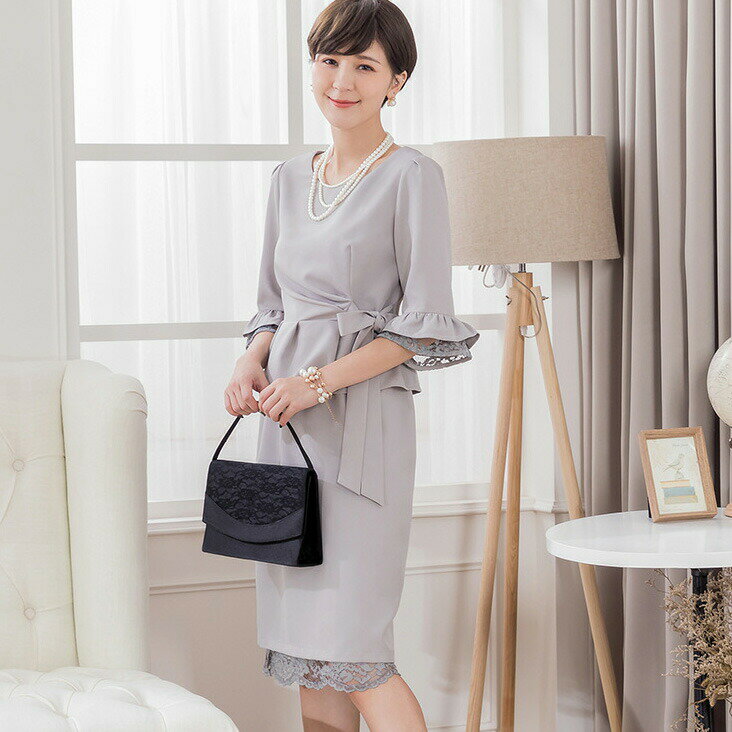 袖はフレアでレースがさり気なく華やかさをプラスし、ウエストマークがスタイルを良く見せます。